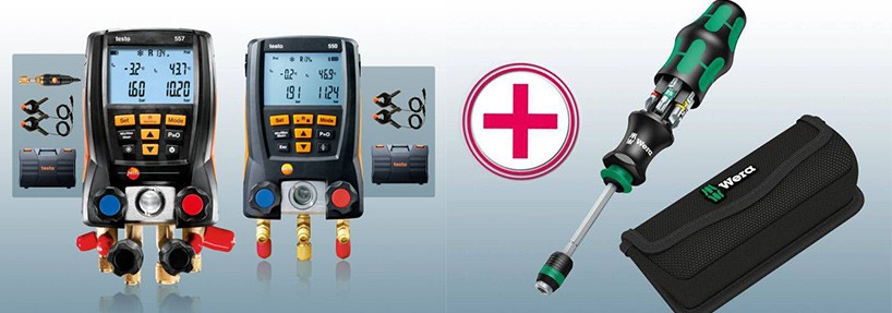 С 01.06.2019 по 31.08.2019 при покупке манометрического коллектора Testo 550 или Testo 557 получите промо-код, дающий право на подарок от Testo, универсальную отвертку Wera.