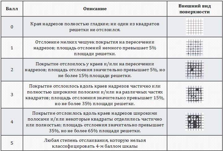 Баллы определения и оценки адгезии 1-4 (по ГОСТ 15140 метод решетчатых надрезов)