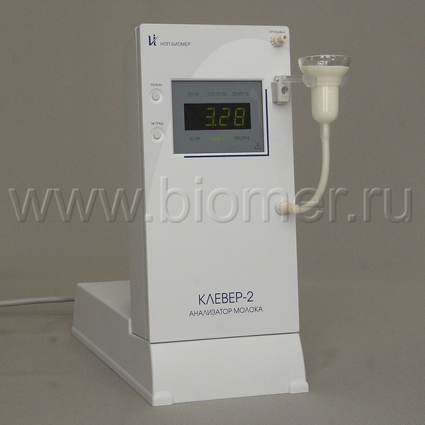 Анализатор молока Клевер-2 (УЛИКОР) обеспечивает экспресс-оценку процентного содержания жира, белка, сухого обезжиренного молочного остатка (СОМО) и плотности в одной пробе свежего цельного, консервированного молока или сливок.
