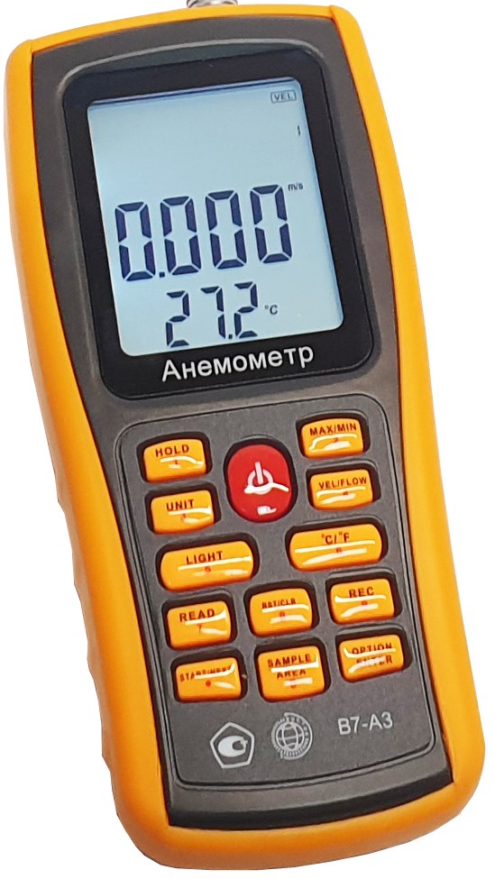 Модификация В7-А3 (термоанемометр, телескопический выносной зонд-“обогреваемая струна” с гибким наконечником) представляет собой мобильный многофункциональный микропроцессорный анемометр ручного формата. Он состоит из электронного блока с измерительным зондом выносного типа. Применяется для однократного и периодического измерения температуры и скорости направленного воздушного потока и других газов в вентиляционных каналах и системах кондиционирования с вычислением объёма расхода, средних, максимальных и минимальных параметров воздушного потока.