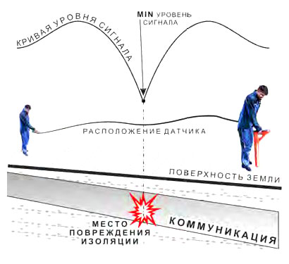 При приближении к месту повреждения сначала с датчика плавно возрастает, достигает максимального значения при положении первого оператора над местом повреждения, далее резко убывает до какого-то минимального значения при примерно симметричном расположении операторов относительно места повреждения, затем по мере удаления от места повреждения он снова резко возрастает и далее плавно убывает. Место повреждения будет находиться посередине между операторами, в тот момент, когда сигнал достиг минимального значения.