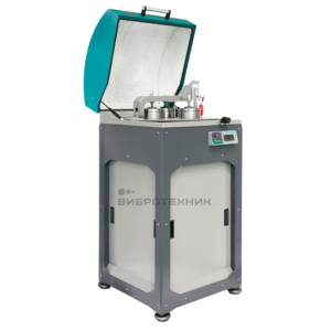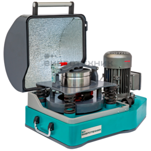 На опорной плите через пружины смонтирована платформа с закрепленным на ней быстрозажимным устройством и чашей в сборе (состоящей из крышки, кольца, ролика и непосредственно чаши). Вращение от электродвигателя передается через ременную передачу на приводной вал, который смонтирован на плите в подшипниковом узле. От него крутящий момент передается через эластичную лепестковую муфту к дебалансу, закрепленному на оси платформы.
