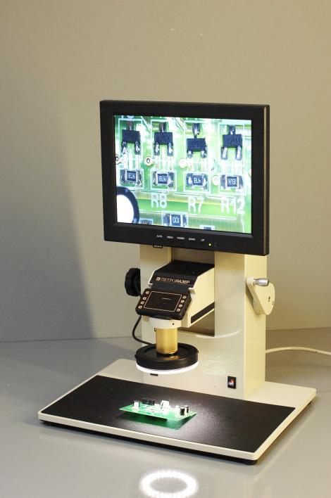 Микроскоп с кольцевым светодиодным осветителем белого света и зум- объективом, предназначенный как для пайки электронных компонент на плату, так и для контроля качества пайки (отмывки флюсов) в ультрафиолетовом освещении. Имеет также освещение снизу (проходящий свет, для контроля совмещения и металлизации отверстий). Может сохранять изображения на карту памяти. УФ- осветитель, вакуумный пинцет для установки компонент на плату — поставляются по отдельному заказу.