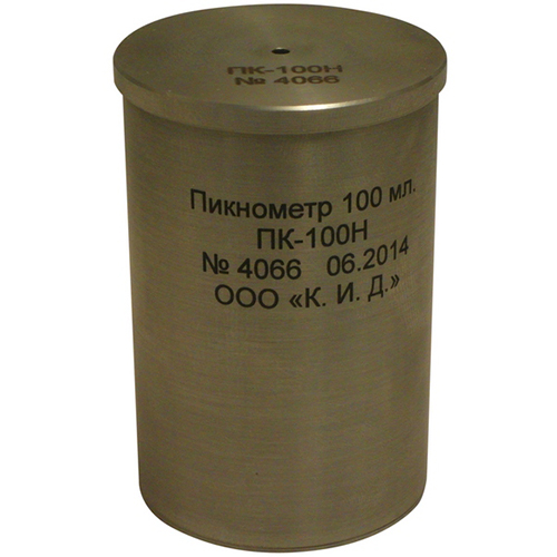 Пикнометр представляет собой стакан с притертой крышкой с отверстием в центре для выпуска излишков испытуемого материала. Пикнометр изготовлен из нержавеющей стали.