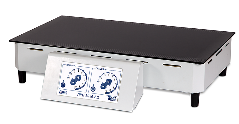 Плита нагревательная лабораторная ПРН-3050-2.2 имеет нагревательную поверхность из стеклокерамики и выпускается в двух модификациях: с встроенным и выносным блоком управления. Нагревательная поверхность плиты ПРН-3050-2.2 имеет две секции нагрева, которые могут работать как одновременно, так и по отдельности.