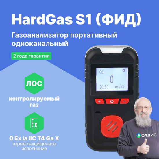 Портативный одноканальный газоанализатор HardGas S1 (ФИД) с фотоионизационным датчиком — для автоматического непрерывного измерения концентраций токсичных газов, горючих газов, кислорода и углекислого газа в воздухе рабочей зоны промышленных помещений и открытых пространств промышленных объектов, а также выдачи сигнализации о достижении содержания определяемых компонентов установленных пороговых значений.