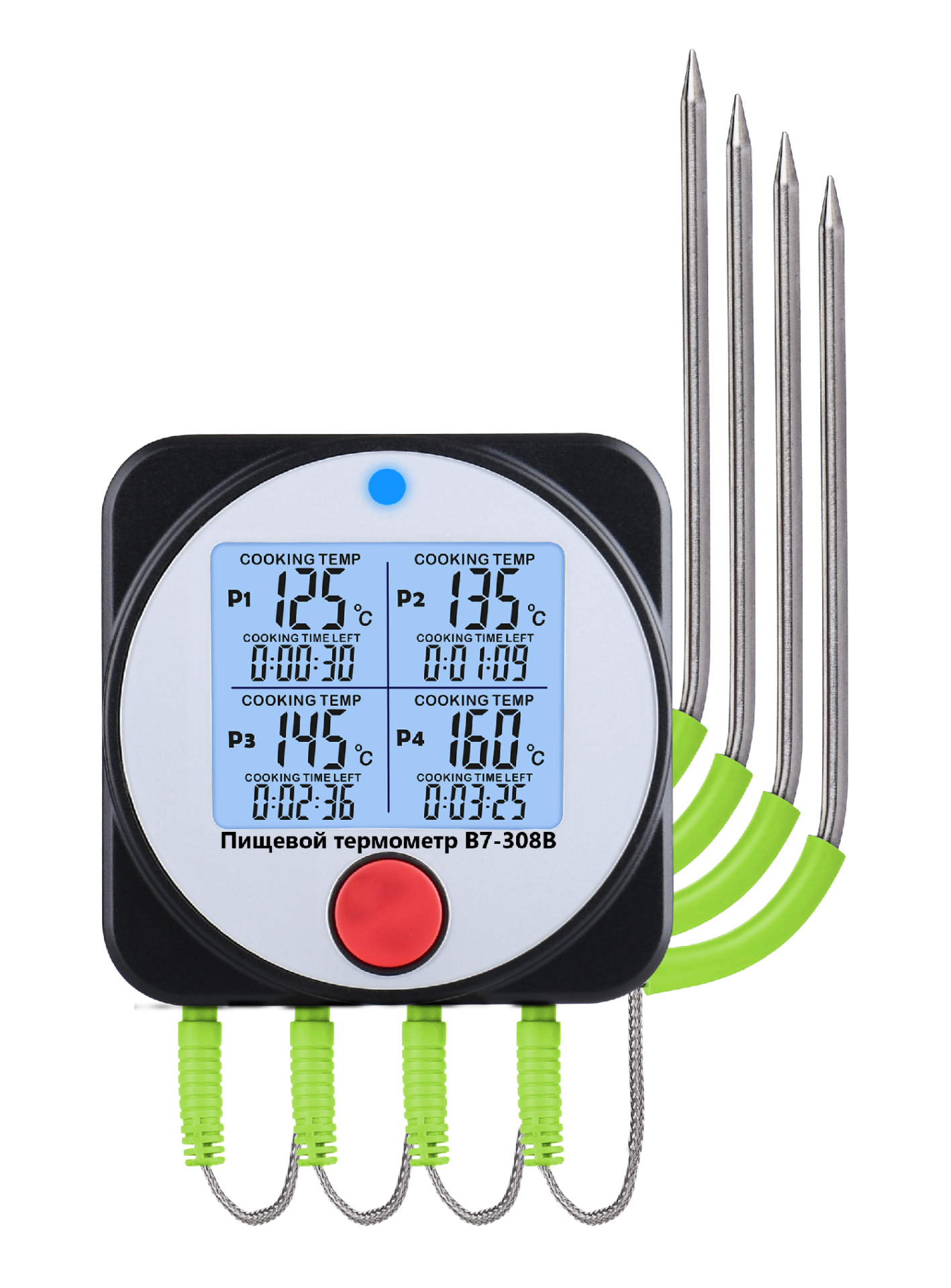 Модель В7-308В – это погружной (проникающий) термометр контактного типа с датчиками выносного исполнения для удалённого контроля температуры при заморозке, охлаждении или горячей прожарки (в печи, духовке, на гриле, в первую очередь барбекю – BBQ) пищевых продуктов. Термометр может быть также использован для контроля процесса изготовления резин и пластмасс.
