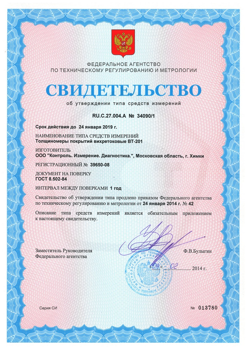 Вихретоковый толщиномер покрытий ВТ-201 внесен в государственный реестр средств измерения под номером №39650-08, сертификат RU.C.27.004.A №34090/1.