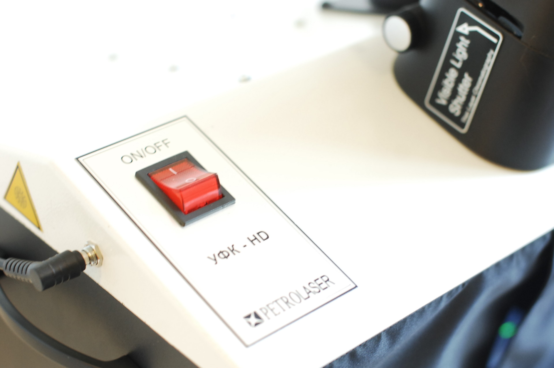 Безопасность зрения лаборанта обеспечивается как используемым защитным УФ-фильтром, который установлен перед окуляром, так и гораздо более редкой необходимостью наблюдать образец визуально: его прекрасно видно на экране дисплея или компьютерного монитора. УФ-осветитель к аналитическому кабинету снабжен специальными светоизлучающими диодами мощностью 20 Вт (365 нм)  + 15 Вт (254 нм) и спектрально-селективными фильтрами (увиолевое стекло). Такая конструкция и оптическая схема позволяют добиться отсутствия мешающего видимого излучения и повысить контрастность и обнаружительную способность при исследовании.